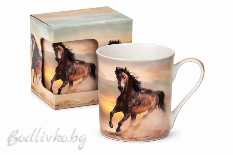 Елегантна чаша с впечатляващо изображение на благороден кон, развяващ грива в динамичен галоп насред пустошта. Топлите нюанси и реалистичният детайл създават усещане за свобода, сила и хармония с природата.