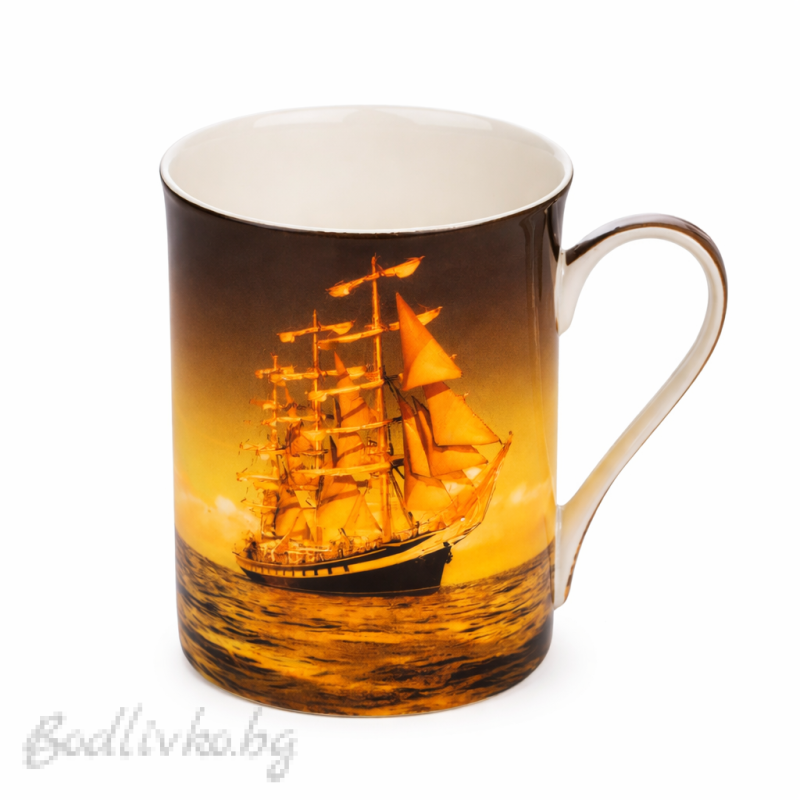 Елегантна чаша за топли напитки с впечатляващо изображение на величествен кораб, носещ усещане за приключение, свобода и морска романтика. Топлите златисти нюанси и детайлният дизайн създават артистична атмосфера и превръщат всяка пауза за кафе или чай в специален момент.