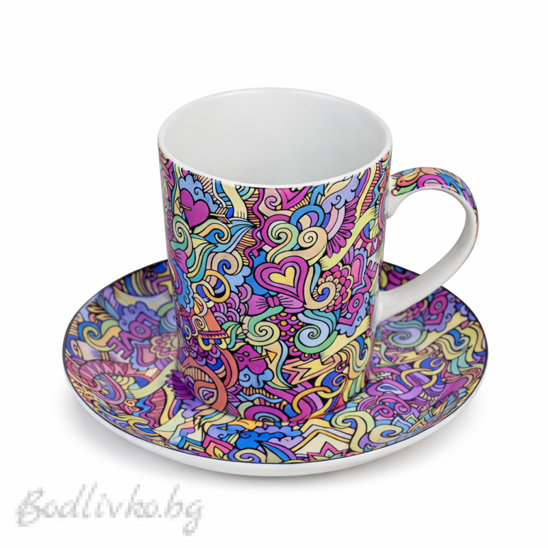 Луксозна чаша с чинийка от фин костен порцелан с впечатляващ абстрактен дизайн в богата цветова гама. Артистичните мотиви придават модерно излъчване и превръщат всяка напитка в стилно изживяване.
