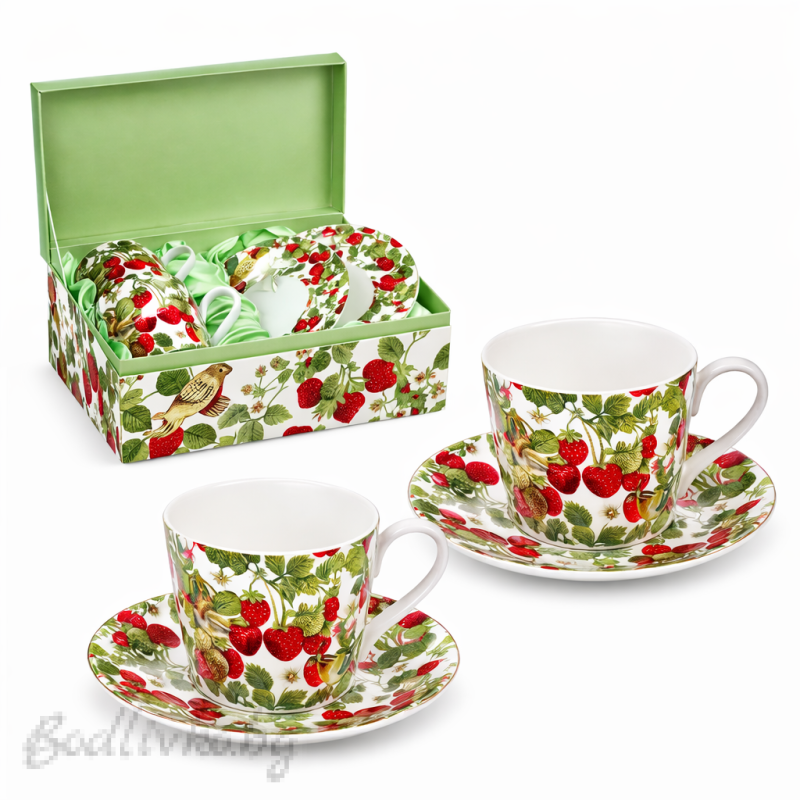 Луксозен комплект чаши за кафе от фин костен порцелан с изискан английски дизайн на ягоди и зелени листа. Свежите плодови мотиви придават естествен чар и създават уютна атмосфера при всяко поднасяне на кафе или чай.
