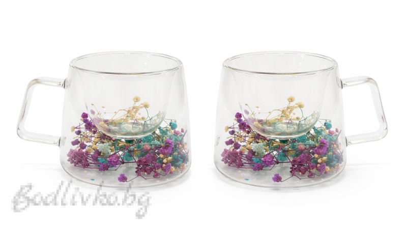 Красив комплект от 2 чаши от двойно стъкло с истински сушени цветя, които създават впечатляващ декоративен ефект и превръщат всяка напитка в истинско удоволствие. Цветята са поставени между стените на стъклото и придават уникален, артистичен вид на всяка чаша.