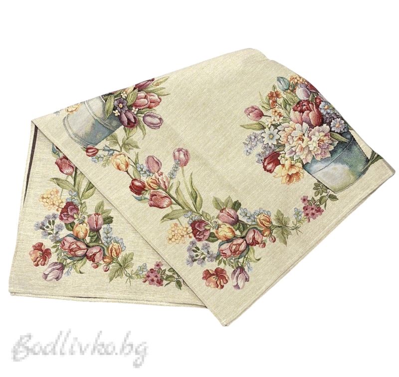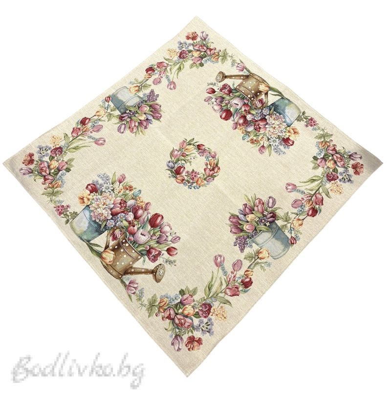 Карето за маса „Цветна наслада“ е стилен декоративен текстил, който внася свежест, цвят и настроение във всяко помещение. Дизайнът е вдъхновен от красотата на пролетната градина и включва богата композиция от лалета, цветни букети и градински лейки, подредени в декоративен венец около централната част на карето.