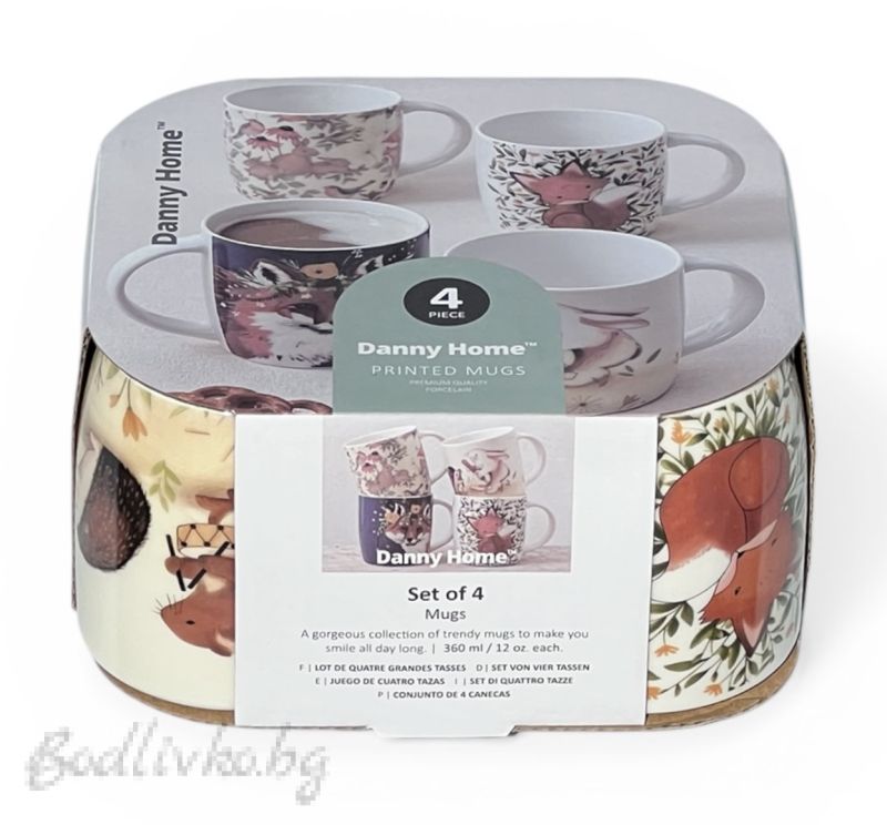 Комплектът порцеланови чаши Danny Home включва 4 стилни чаши с нежни илюстрации на горски животни, които придават уют и настроение на всяка кухня или трапеза. Всяка чаша е декорирана с различен дизайн, включващ симпатични животни като лисица, зайче и други горски мотиви, съчетани с декоративни листа и природни елементи.