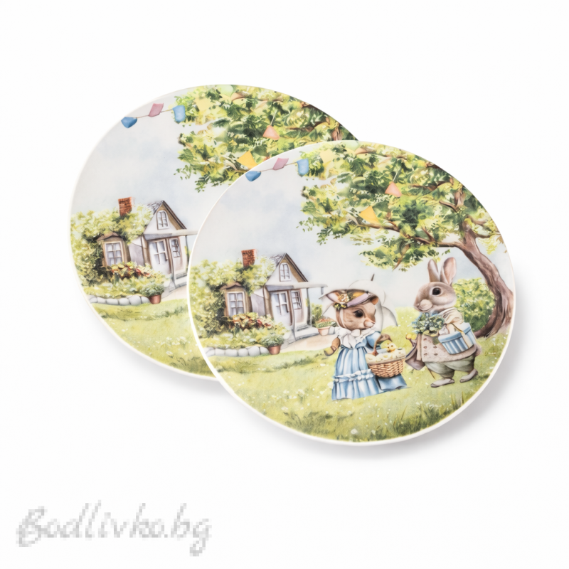 Комплектът включва две чинии с диаметър 20,5 см, идеални за сервиране на великденски сладкиши, яйца или други лакомства.