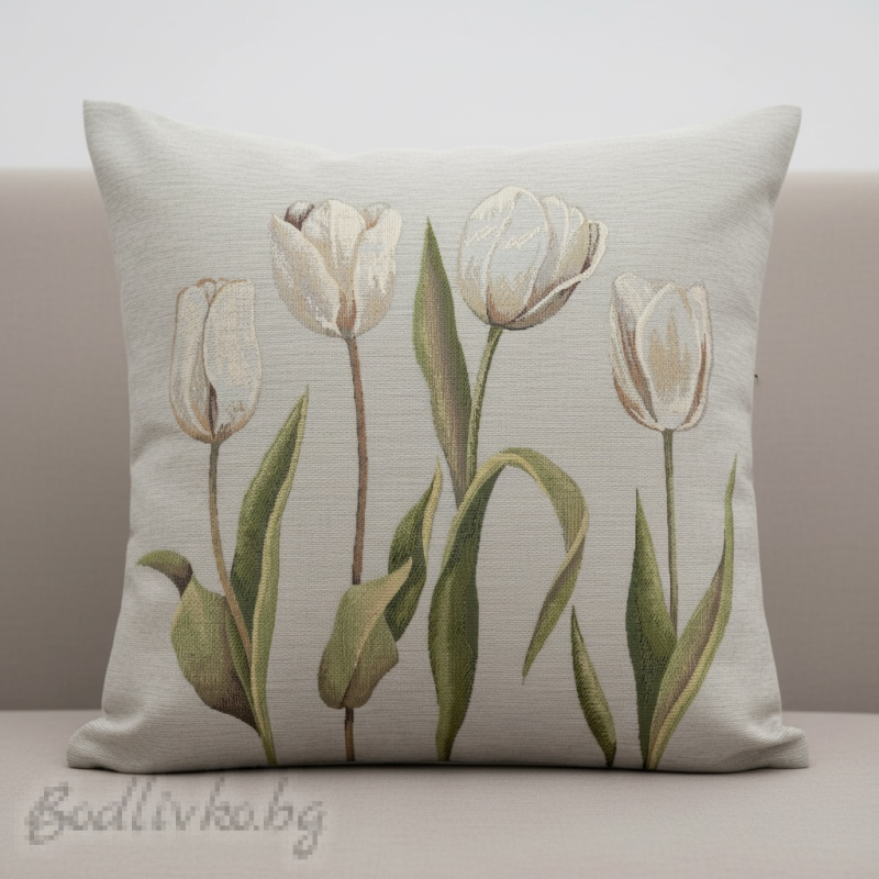 Внесете свежест и елегантност във вашия дом с калъфката за възглавничка "Бели лалета"! Тя е с удобен размер 45/45см и се отличава със своя очарователен дизайн.