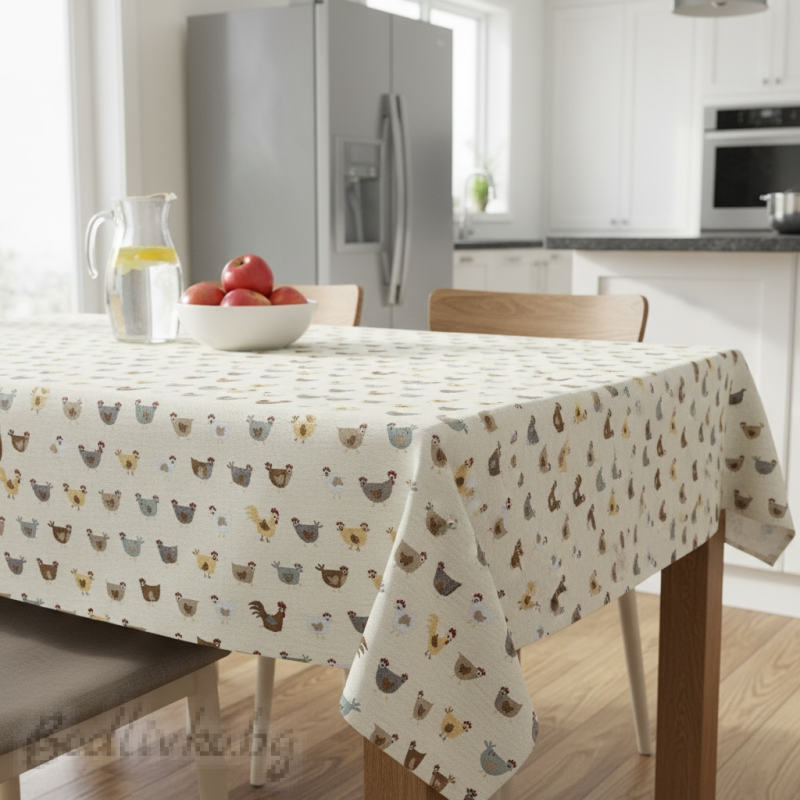 Подарете на вашата трапезария нов облик с нашата покривка за маса Жакард "Кокошки" и се насладете на всяко хранене с любимите си хора!