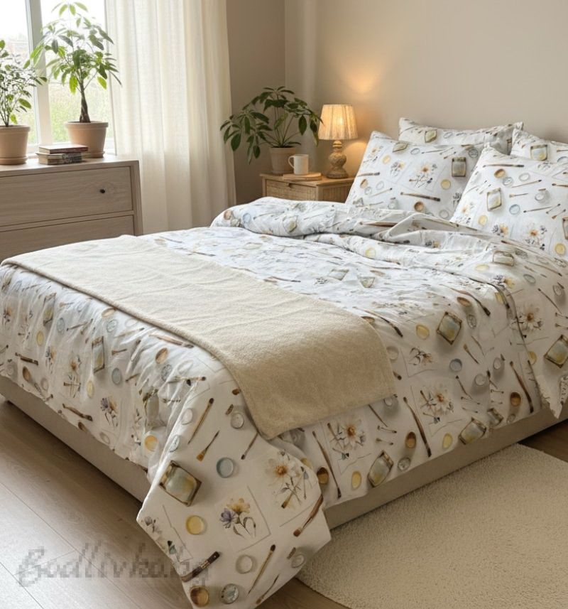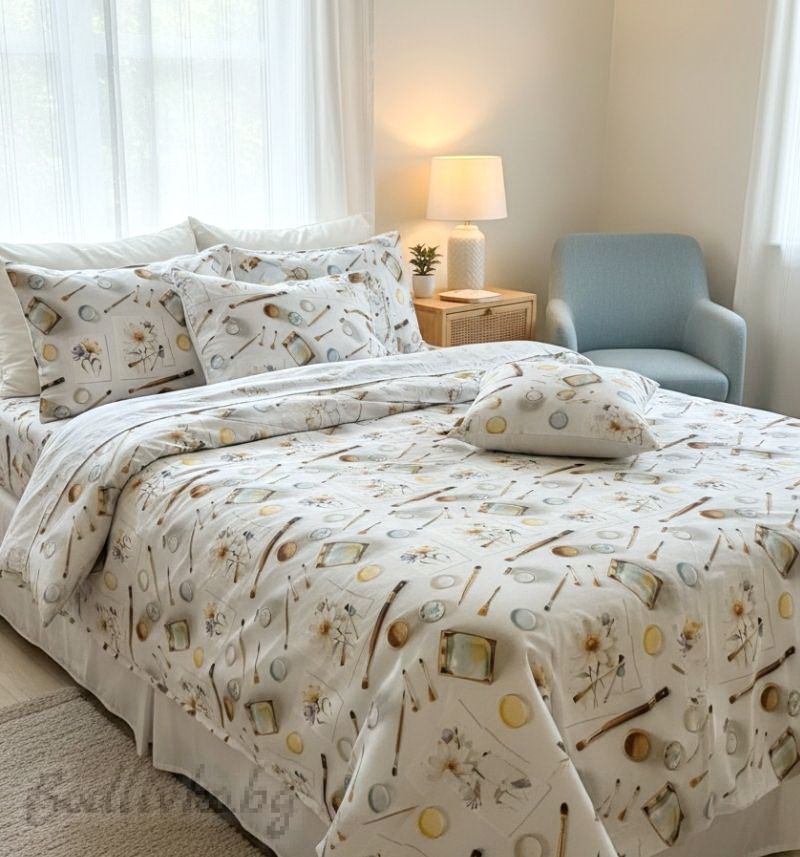 Композицията носи настроение на лято, свежест и чистота, като озарява интериора и придава енергия на спалнята. Жълтите нюанси се съчетават хармонично със зелените детайли, което прави комплекта подходящ както за светли, минималистични пространства, така и за по-цветни интериори.