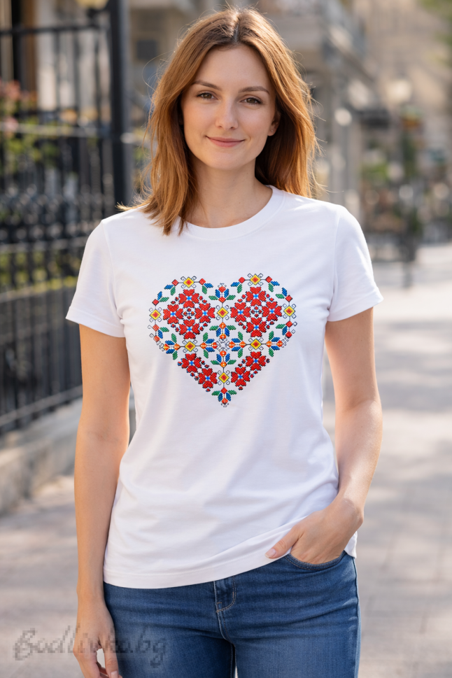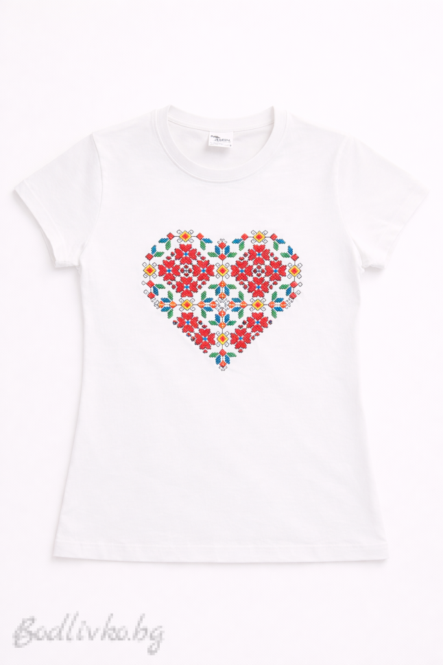 Начало МАШИННА БРОДЕРИЯ Дамска тениска с бродерия, Шарено сърце, 100% памук